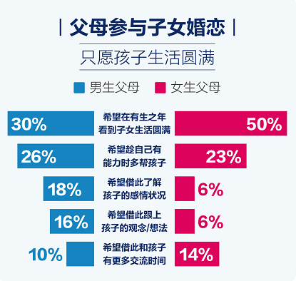 《报告》显示,希望能在有生之年看到孩子生活圆满,是五成女生父母和三成男生父母,的愿望;还有超两成父母考虑的是希望趁自己有能力时多帮孩子。