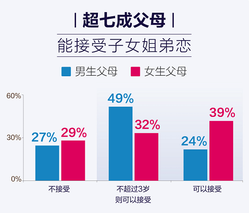 《报告》显示,超过七成的父母,能够接受子女“姐弟恋”。然而,没有任何一种世俗观念的转变,是一蹴而就的,因此还有近三成家长完全不接受子女“姐弟恋”。