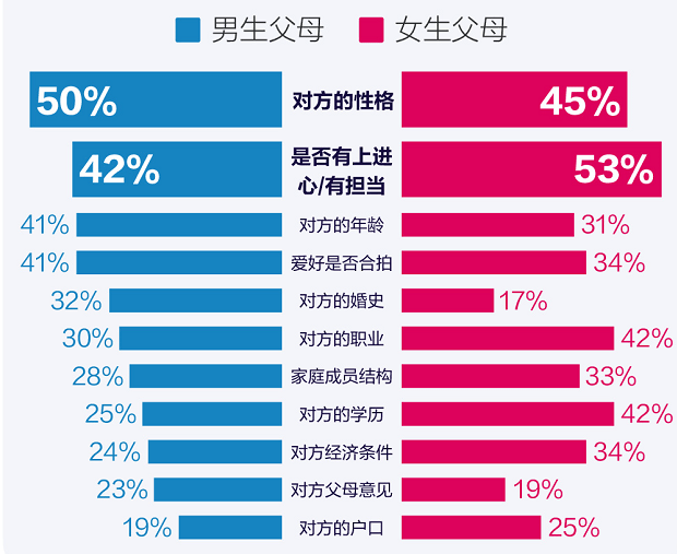 其实,这是片面的观点。在他们的眼里,子女过得幸福才是最初心的愿望,子女婚恋对象的内在美才是优先考虑的条件。如同《报告》所示,“性格和上进心”是父母们对于子女另一半普遍最看重的条件。