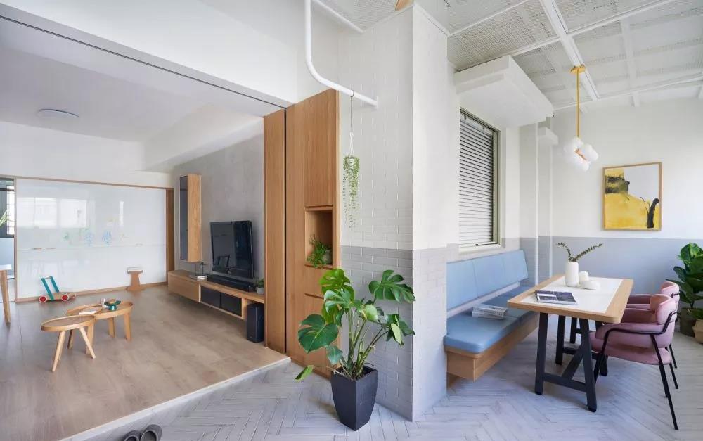 利用阳台设计卡座,当休闲区使用,满足一家人的休闲和娱乐,忙碌了,后,能悠闲的坐在阳台卡座上,欣赏城市的美景或者陪孩子在家里玩闹,生活温暖舒适,超惬意。