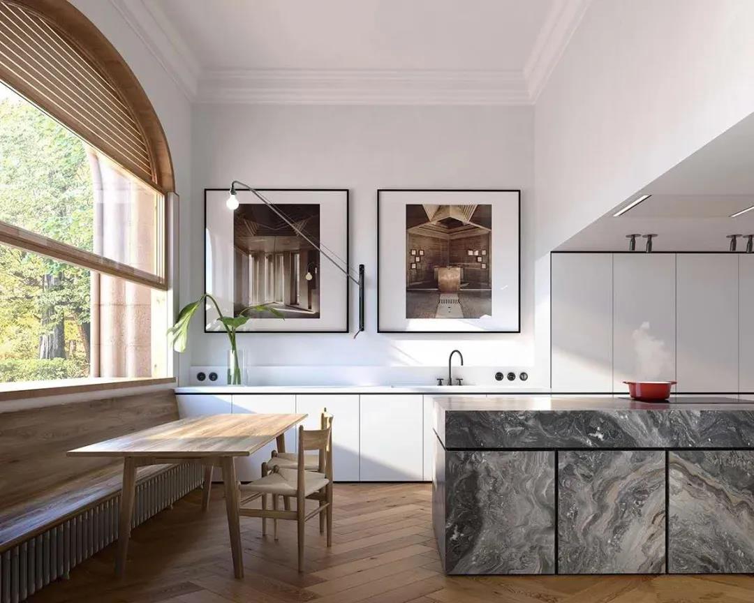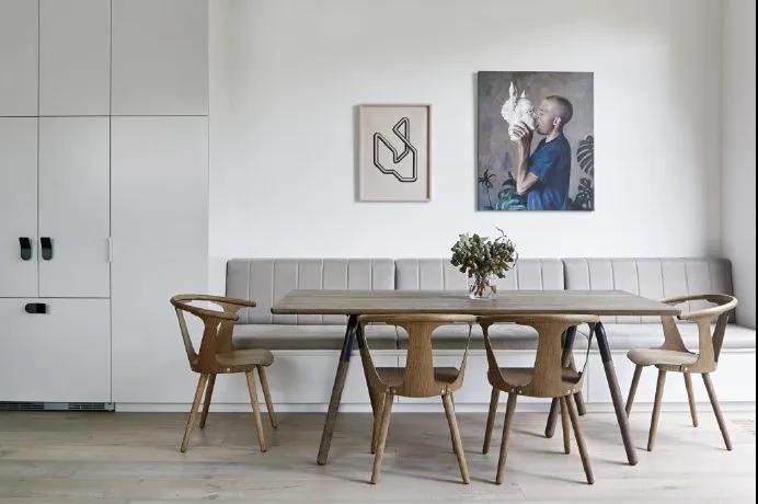 如果餐厅面积比较大,也可设计成卡座+柜子,这样能,程度增加收纳空间哦~
