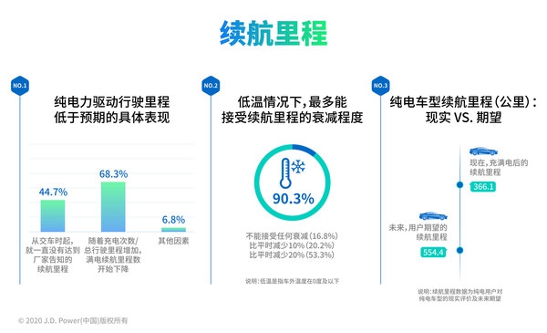 用户对续航里程的评价与期望,数据来源:J.D. Power 2020中国新能源汽车体验研究(NEVXI)