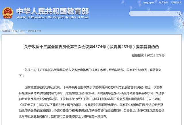 近日,教育部对政协十三届全国委员会第三次会议中所提出的《关于托儿所幼儿园纳入义务教育体系的提案》进行了回应,回应的主要思想是:由于义务教育具有普及、免费和强制等特点,所以学前教育是否应该纳入义务教育体系,还需进一步论证。而之所以产生这样的讨论,其根本原因在于老百姓希望政府承担更多责任,因此当务之急是解决严重的"入园难、入园贵"的问题。