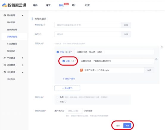 第一步:登录校管家云课系统,在【网校管理】,选择新增【直播课/录播课】,依次填写课程信息。