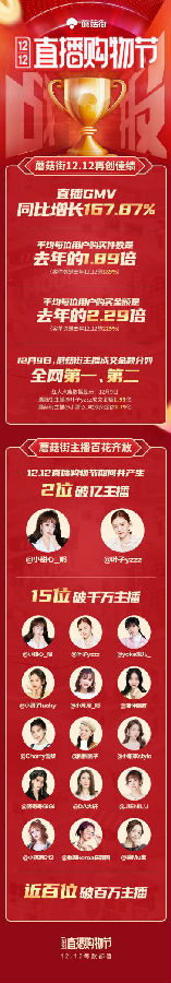 12月13日,蘑菇街公布以“每款都值”为主题的双十二战报,直播GMV同比增长167.87 %。主播表现方面尤为亮眼,蘑菇街不仅头部主播小甜心、叶子延续双十一销售力,单场成交金额再次破亿。还孵化出了小贤子、小月月、潘仲晴、雪梨、圆圆圆子、小雅、颜奇奇、大轩、JINILU、小琪琪、敏恩、慕宝12位成交金额破千万的中腰部主播,再加上瑜儿,此次蘑菇街共有15位成交金额突破千万的主播,其中11位主播成交金额,破千万。由此可见,在双十一推出“美力计划-鲤跃行动”后,蘑菇街成功培育超过10名中腰部千万主播,,主播数量增长275%,成效显著。