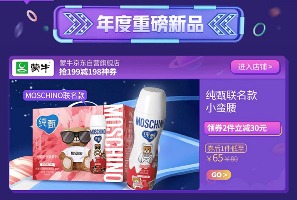 蒙牛纯甄小蛮腰堪称今年饮品界的网红,在30日的大势新品赏,蒙牛推出的重磅新品纯甄MOSCHINO联名款小蛮腰红西柚口味酸牛奶将在京东,发售,不仅带来料实材真的美味,更有MOSCHINO创意总监Jeremy Scott亲自设计的定制包装,从颜值到口感都棒棒的!一定会给跨年夜带来独特的新潮乐趣。