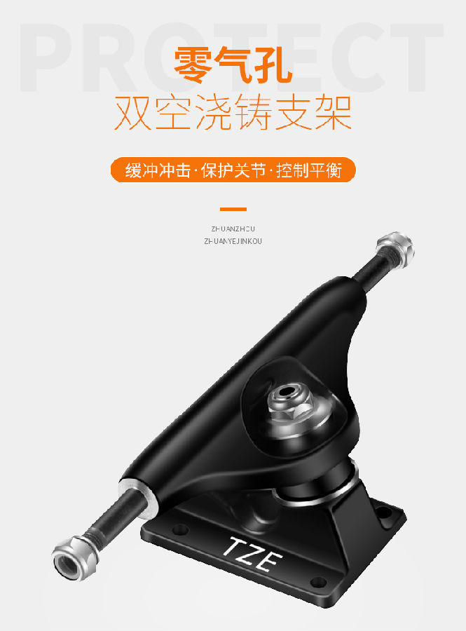 首先,TZE滑板经过全球质检机构的国际专业滑板标准质检合格,安全有保障。其次,在滑板的选材和构造方面,TZE也苦心孤诣:板面采用7层加拿大优等枫木,浇铸双空工艺支架,既保证了优质的质量,扛造的性能,又使得滑板轻盈,抗冲击性强;轴承设计了防尘台以延长使用寿命,并且采用加厚尼龙保持架,即使高速高温情况下也不会爆轴解体,安全性高,静音效果好 ;聚氨酯滑板轮SHR102A高回弹 ,不仅耐磨,而且可以使滑板安全稳当的急转弯,并且使滑板附着摩擦力加强,速度增加,甚至可以滑上垂直表面;滑板支架高回弹助力效果非常好,浇铸支架内没有气孔不会断裂,双空减轻整体滑板重量做动作更轻松 。