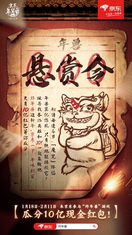 而今,过年已经成为中国人一年中最隆重的节日,大家满怀着对过年一家团圆的期盼,期待着除夕夜放鞭炮迎新年的热闹场景。快过年了,京东发出高达10亿赏金的“年兽悬赏令”,邀你一起放爆竹、炸年兽,在传统习俗中享受春节的快乐。悬赏令来了,准备好接令了吗?