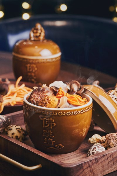 整道菜,用了十多种蔬菜,如萝卜,菌菇,慢煨8小时吊出上汤。花菇、鸡纵菌、鹿茸菌等十几种菌菇以精准的配比,分别加入底汤慢炖出香气。菌菇性寒,主厨特别入了药材与米酒,驱散寒气。