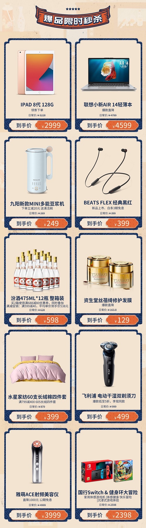 此外,京东直播还为消费者带来,优惠,部分年货低至5折,网友还可以瓜分海量京豆,参与互动抽奖等福利。飞利浦电动干湿双剃须刀、汾酒、百事可乐、美的3匹新一级空调锐云等爆品都将惊喜降价。每一件精品年货背后都蕴藏着年味儿, 等你来置办。