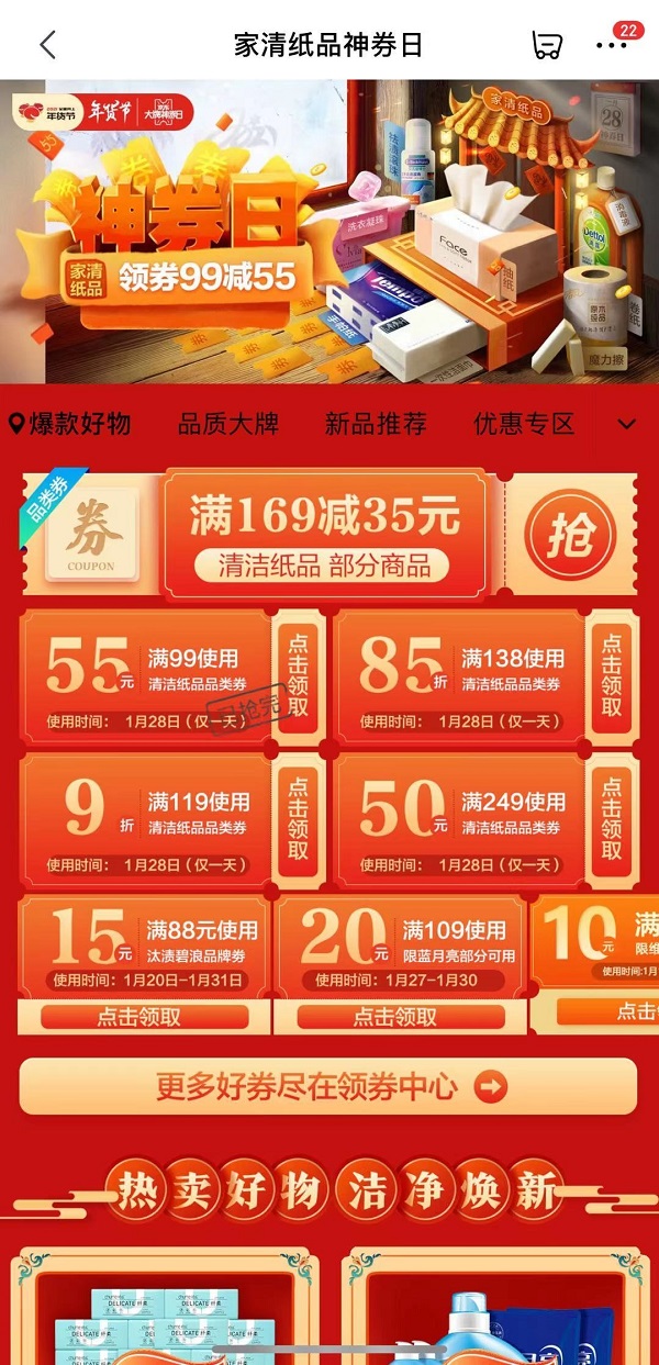 这不,京东已经为大家考虑到了,1月28日,京东家清纸品神券日让你一次性买齐所有清洁装备。不仅有169减35券,还有99减55神券等你来抢,部分商品满119元还有9折优惠。京东为大家贴心筛选了一系列家清产品,领卷后直接去使用,一篮子用品即刻采购。而且家清用品使用频率高,需求大,趁着优惠入手多囤一点也很划算。