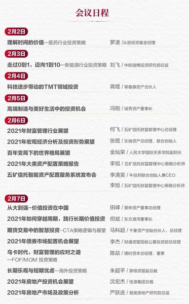 2021年2月2日-2月7日,6天时间里,五矿信托组团17位国家智库专家、财经领域权威专家和资深投顾等各行业大咖,以线上投资策略会的方式,深度剖析国内外宏观经济形势、全方位解析行业走势及财富行业管理趋势,为投资者呈现一场内容丰富的投资盛宴。