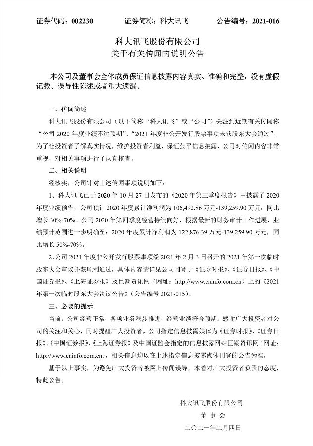 2021年刚过去一个月,多支白马股出现股价异动,投资者心急如焚。针对公司2020年度业绩不达预期”、“2021年度非公开发行股票事项未获股东大会通过”等不实传闻,科大讯飞于2月3日召开线上投资说明会,科大讯飞联合创始人、,副总裁、董秘江涛表示,公司2020年度累计净利润为12.29亿元-13.93亿元,同比增长50%-70%;公司2021年度非公开发行股票事项顺利通过,各项事业发展正在稳步推进。