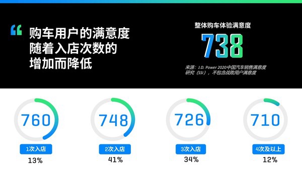 而如果连点成线地看,738分的满意度是由四个部分构成的,其中有进过一次经销店就成交的用户体验,也有去过两次、三次甚至四次才成交的体验。一次入店成交的用户满意度是760分,二到四次入店成交的满意度分别为748分、726分和710分。满意度的变化反映出用户多次入店的体验存在断层,这个断层在过去看点的时代并不曾被发现,同时它也导致了用户体验的下降。