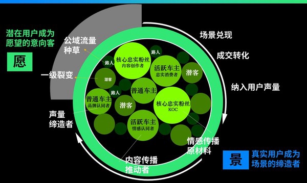 全生命周期的用户运营能力,相当于构筑一个“用户森林”,并产生“由愿生景、由景生愿”的绿色循环圈。循环圈中有车主、潜客和粉丝,有些是意向购买者,有些是无感的普通人。活跃车主和忠实粉丝会主动缔造声量、推广内容,并制造用户与品牌之间情感传播的原材料。这些人自发和共同传播,形成了一个个真实的品牌与用户之间的场景故事,这将会极大影响到公域流量里的潜在客户和无感客户,使他们也产生想了解、购买这个品牌的意愿。
