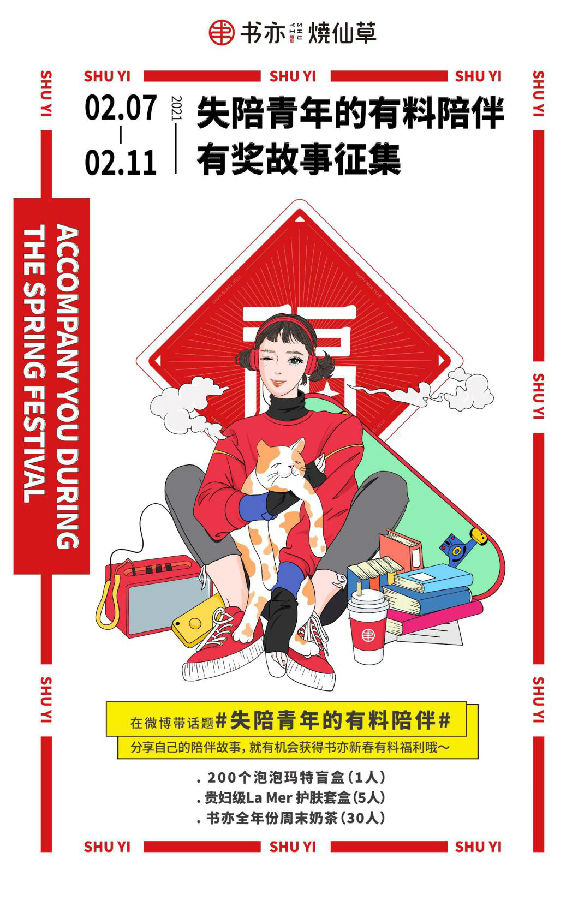 书亦烧仙草,14年来长情陪伴,在这个新春佳节之际,更是推出了“你有故事,我有奖品,寻找2021最有故事的“失陪青年”的活动。在2月7日-2月11日,带话题#失陪青年的有料陪伴#说出你的“有料故事”,抽取1位幸运鹅200个盲盒让你拆到手软以及5位幸运鹅可获得“贵妇 级”La Mer护肤礼盒,还有30位幸运鹅可获得全年份周末奶茶。书亦烧仙草门店布局全国,失陪青年也可以和家乡亲人相约一起,在全国各地共喝书亦烧仙草,共渡甜蜜平安年!