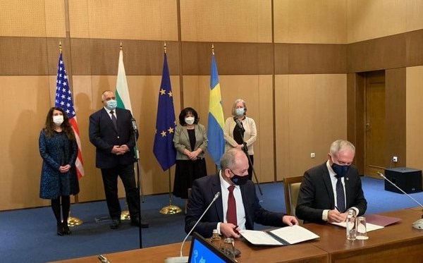 坐位(从左到右):Kozloduy核电站执行董事Nasko Mihov 和西屋欧洲,中东和非洲地区在役电站服务事业部副总裁Aziz Dag;站位(从左到右):美国驻保加利亚大使Herro Mustaf, 保加利亚总理Boyko Borissov, 保加利亚能源部部长Temenuzhka Petkova 以及瑞典驻保加利亚大使Katarina Rangnitt