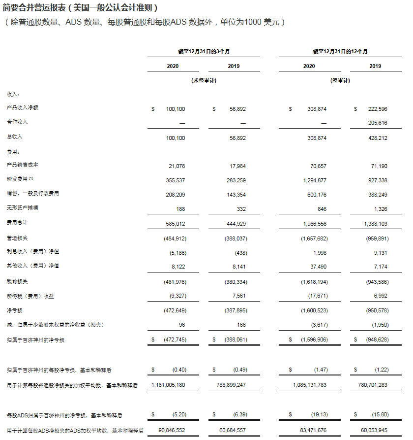 截至2020年12月31日的三个月和十二个月,产品收入分别为1.001亿美元和3.0887亿美元。产品收入来自于百泽安®(替雷利珠单抗)在中国的销售和百悦泽®(泽布替尼)在中国和美国的销售,以及与安进公司和百时美施贵宝公司达成合作协议在中国的授权产品销售