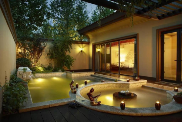 后院里那氤氲着热气私汤泡池,在春日里伴着春风沐浴,温度刚刚好,自在!