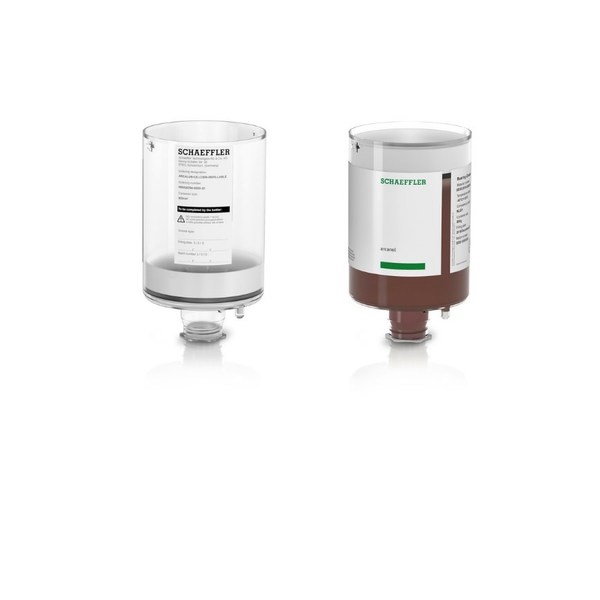 CONCEPT2、CONCEPT4和CONCEPT8润滑器的润滑盒有空润滑盒或预先注满润滑剂的润滑盒两种版本。因此,这些设备也可使用舍弗勒专有的Arcanol系列以外的润滑脂进行操作,并且最多可以加注3次(此图为:CONCEPT8润滑盒和空润滑盒)。