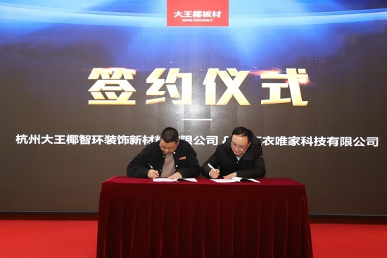 开年即发力,起步即冲刺。3月4日,大王椰家具板渠道负责人吴剑超与浙江衣唯家科技有限公司总经理陈春雷正式签订合作协议,后者聚焦专注全屋智能家居产品的研发、设计、制造和销售,其坚持好品质、好服务、好体验的理念亦与大王椰不谋而合,双方强强联合、优势互补,积极探索市场新机遇。
