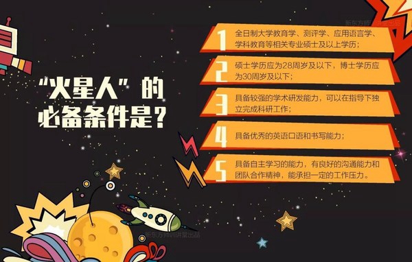 “火星计划”对于教学培训生的选拔标准和流程十分严格。候选人需拥有硕士以上学历,毕业于世界一流高校,具有较强的学术研究能力、逻辑思维能力、优秀的英语口语和书写等能力和素质。简历通过初筛后,需经过小组学术讨论、多对一面试、专家面试等多重环节考验,才能领到“火星人”聘书。
