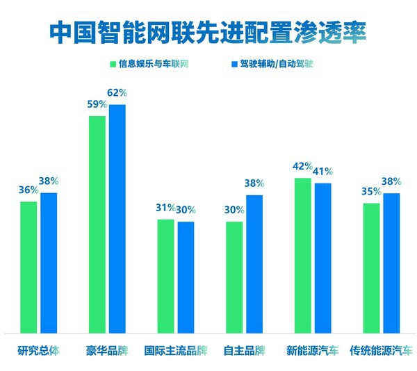 从用户反馈角度看,整个中国市场中,豪华品牌的智能网联先进配置的渗透率相对较高,其中自动驾驶功能相关配置的装配率更是遥遥领先。同时,新能源汽车比传统主流品牌燃油车的配置更丰富。