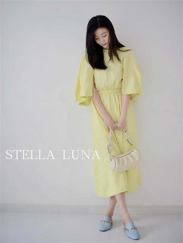 2021PANTONG色流行色鹅黄色长连衣裙,如同刚刚抽枝的新绿,充满了生命的力量!清新的鹅黄色搭配简约的腰身设计,配合宽大的袖摆,这样的一袭长裙上身,即使是肉肉的女生也显得娇小可人。长裙纯棉的面料质感,带着天然的柔和之气,没有一点攻击性,鹅黄色与baby 链链拖,更让@小娥娥娥娥充满了春天的温暖感。这双STELLA LUNA链链拖也成了支撑柔美身躯的,支撑。皮质面料给人以精致、大气、自信的感觉,再加上别致的金属链条,更加凸显了女性柔美中的自信,温柔中的独立,仿佛在告诉对方:“我很温柔,但是我并不懦弱。”整个搭配既体现了女性的柔美,又展现了新时代女性的独立与自信。