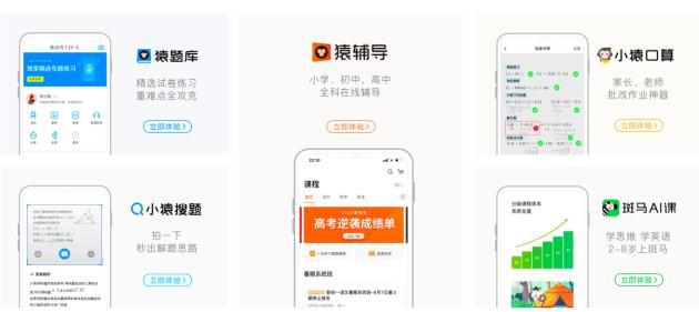 发展至今,猿辅导在线教育已然成为在线教育行业的独角兽,旗下已拥有猿辅导网课、猿题库、小猿搜题、小猿口算、斑马AI课等多款智能学习产品,服务对象已涵盖从学龄前到小初高全学段,服务范围已覆盖全国多个省市县。从猿辅导网课、猿题库、小猿搜题、小猿口算到斑马AI课,分别为不同年龄段的学生提供了各具特色的服务,同时又相互配合,覆盖了学生全部学习场景。值得一提的是,“猿辅导网课”已经成为国内中小学网课领导品牌,“斑马AI课”则是国内学龄前,的在线学习智能教育平台,两大网课平台正价在读用户人数之和已突破400万,成功让猿辅导在线教育成为国内网课用户规模,的在线教育企业。