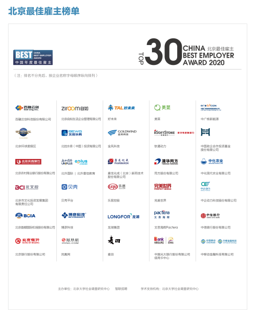 其中百融云创科技股份有限公司、北京自如生活企业管理有限公司、好未来、美菜、中广核新能源、北京国际度假区有限公司、北控水务(中国)投资有限公司、金风科技、软通动力、中国政企合作投资基金股份有限公司、北京农村商业银行股份有限公司、北外壹佳教育、康龙化成(北京)新药技术股份有限公司、同方股份有限公司、中化现代农业有限公司、北京市文化投资发展集团有限责任公司、贝壳平台、乐居控股、,世界、中企动力科技股份有限公司、北京首都国际机场股份有限公司、博彦科技、龙湖集团、文思海辉技术有限公司、中信银行股份有限公司、北京银行股份有限公司、凤凰网、麦田、中国光大银行股份有限公司信用卡中心、中移动金融科技有限公司成为北京地区最佳雇主三十强。