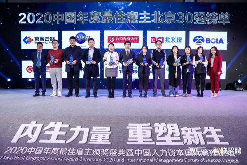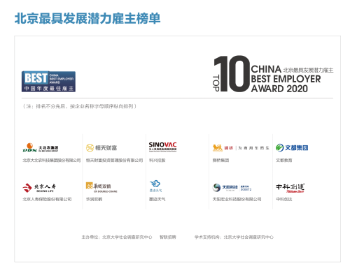 北京大北农科技集团股份有限公司、恒天财富投资管理股份有限公司、科兴控股、狮桥集团、文都教育、北京人寿保险股份有限公司、华润双鹤、墨迹天气、天阳宏业科技股份有限公司、中科创达荣膺2020年中国年度最佳雇主北京,发展潜力雇主。