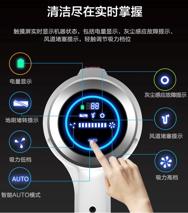 在解决了动力问题之后,斐纳TOMEFON与时俱进,把智能做到了,。斐纳TOMEFON无线吸尘器采用人机交互设计,该吸尘器的手柄内嵌有一块OLED触控屏,用户可以通过触控屏控制和观察吸尘器,包括调整吸力档位,观察剩余电量等。