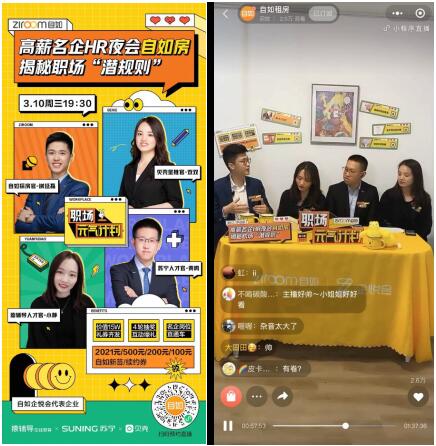 3月10日,自如联合贝壳、猿辅导、苏宁, 4家企业HR在自如房源内进行直播,为职场人解答职场相关问题、教授职场加薪秘籍、提供岗位JD、以及送出各类职场好物和租房优惠。