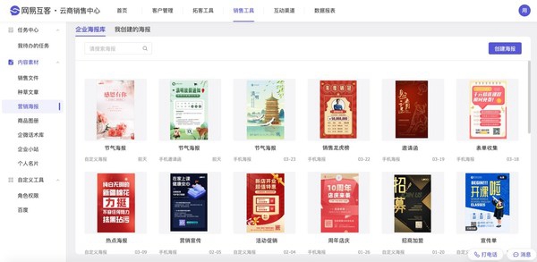 在“销售工具-营销海报”中点击创建海报,即可查看海量海报图片素材资源。用户根据不同的使用场景和适用行业,筛选、一键应用内海报素材,精准搜索,方便快捷。