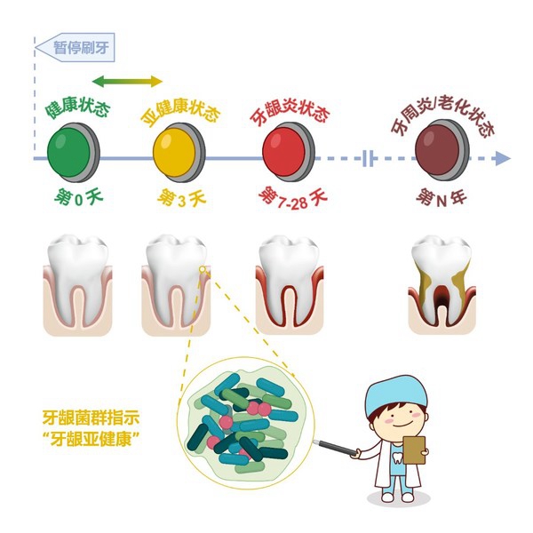 有趣的是,如果该“牙龈亚健康”状态没有通过恢复刷牙等口腔清洁护理手段加以遏制而任其发展,其牙龈菌斑菌群将以高出10倍的速度加剧衰老。牙龈菌斑菌群随着人体生理年龄的增长而发生规律性的变化,而在停止刷牙的28天内,其牙龈菌斑衰老程度就相当于牙龈健康时1年时间的衰老,也就是在不到一个月时间里“老化”了将近一岁。因此,“牙龈亚健康”状态可能与牙龈的衰老密切相关。