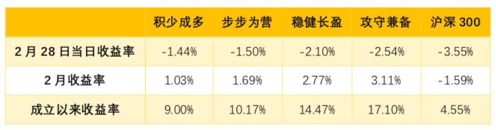 在2月28日市场大跌的情况下,“慧智投”四组风险组合均跑赢沪深300,延续了2月3日“黑天鹅”事件中表现出的极大抗风险能力。