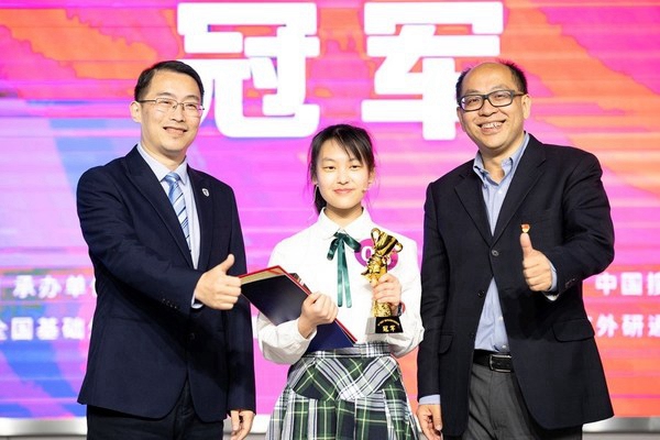 北京外国语大学党委常委、副校长丁浩(左一),中国搜索党委书记、董事长、总裁李俊(右一)为总,南京市中华中学徐成成(中)颁奖 丘玲玲摄