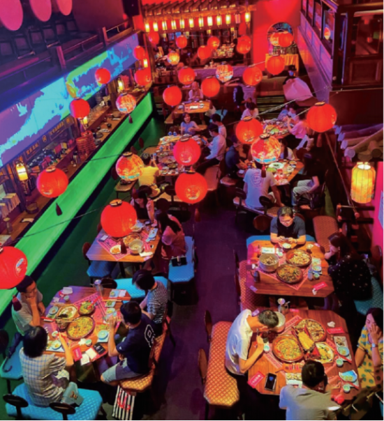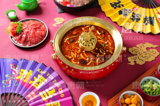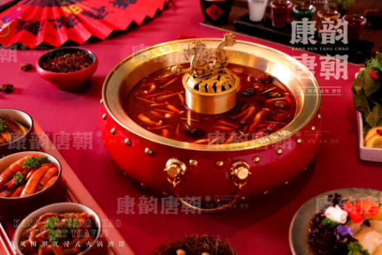 火锅+酒馆,轻松迎合年轻人的喜好,占领用户心智。康韵唐朝火锅酒馆的视觉艺术设计吸引了不少追求潮流和国潮文化的年轻人,用火锅+美酒+卤味烧烤打卡夜生活。