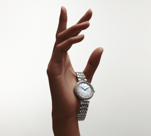 间镀玫瑰金镶石表壳表带和白色贝壳盘的搭配,又瞬间光彩夺目,给人一种轻奢时尚感。