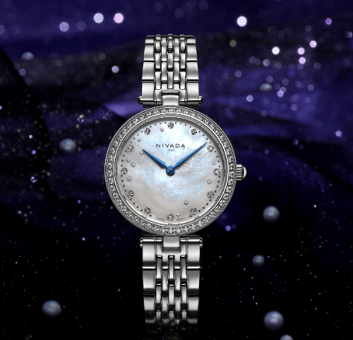 “每个女孩在成长的路上,都曾经对星空有过一份美好的向往,满天星闪耀如梦”!NIVADA尼维达“星空系列”腕表,承载着这份愿望,将满天星与星辰梦想在腕表上呼应呈现。表盘采用天然珍珠贝母,周边印星形刻度,配合表圈满满的闪钻及盘面的12颗镶石刻度,更似夜空中的星辰,如梦幻般熠熠生辉。简洁的七株式表带,双按蝴蝶表扣,佩戴舒适、尽显优雅。将女性的美好愿望与精致优雅的生活追求和满天星的概念融为一体,呈于日常搭配中!