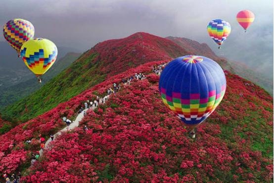 特别是每年的5月份,海拔一千多米的丹寨龙泉山上,漫山遍野弥漫着花的海洋,平时被碧绿包裹的丹寨,如同化了彩妆的安静新娘一样,娇艳无比。闲庭信步之间,白居易形容杜鹃花的一首诗“闲折两枝持在手,细看不似人间有,花中此物似西施,芙蓉芍药皆嫫母”如染耳边,满眼的杜鹃花潮,使人对丹寨流连忘返。
