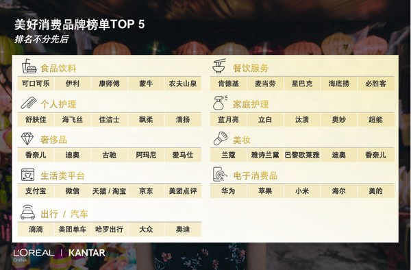 根据消费的反馈,各品类中对“美好消费”引领作用最突出的5大品牌如下(以下数据来源于凯度,品牌排名顺序不分先后):