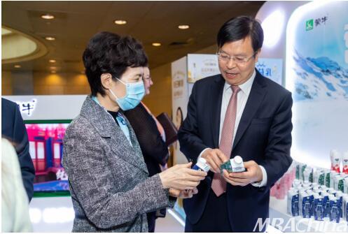 (蒙牛集团执行总裁李 鹏 程向中国贸促会、中国国际商会会长高燕介绍产品)