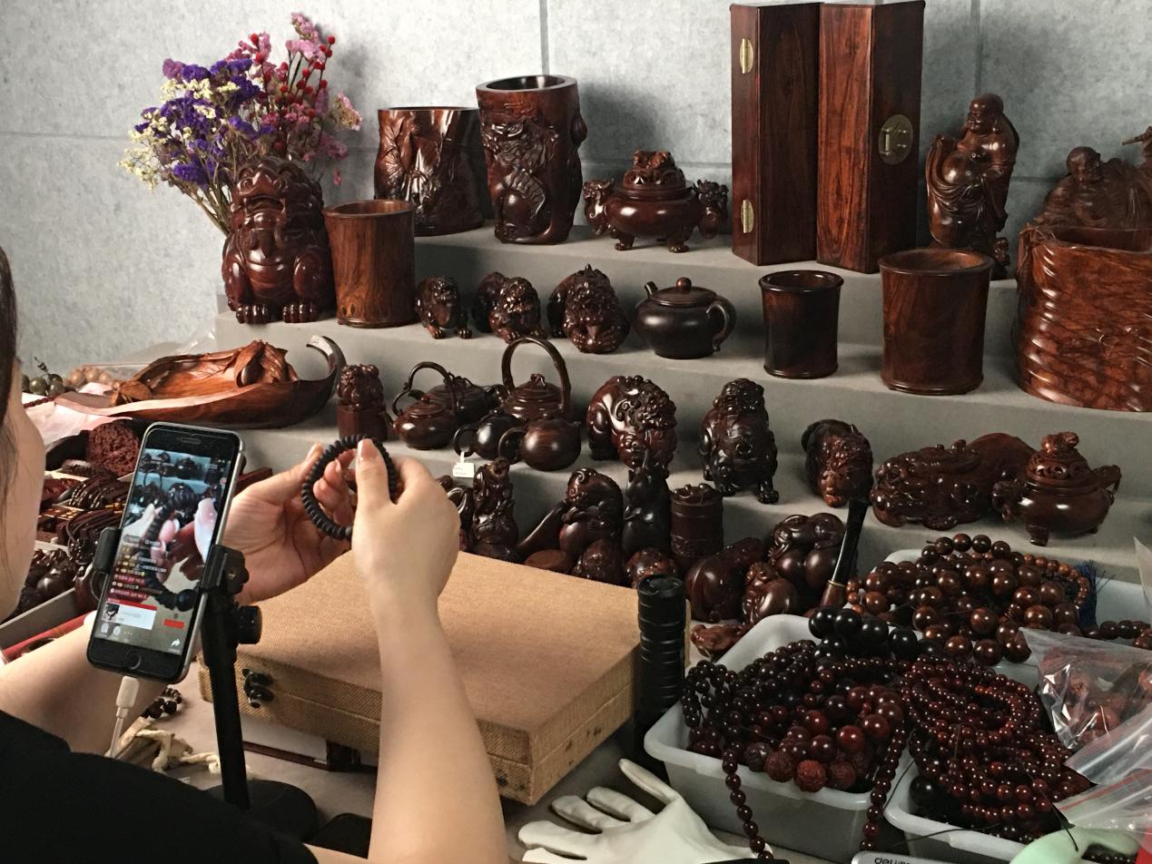 在仙游当地,不愿意坐以待毙的红木商家们纷纷都开始线上转型,尤其在2019年直播概念大火之后,更是许多人一边雕刻、车珠子,一边开直播。