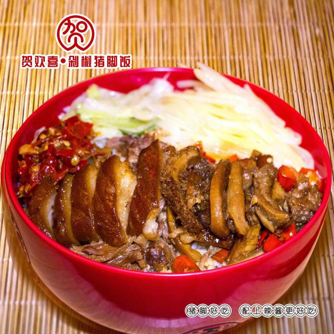 贺欢喜猪脚饭,经秘制卤水长时间熬煮之后出锅;其卤香浓郁诱人,而肉质则松软不烂、融口不腻;切成薄片的猪脚肉浇上一勺卤汁再配上辣椒,味道更加迷人了。对于无肉不欢的人来说,这碗猪脚饭值得一品再品,成为回头客。除了猪脚饭,这里还有卤肉饭、牛肚饭、肉卷饭、鸡排饭等等。想要多种搭配?这里还有贺欢喜肉卷+鸡排饭、贺欢喜猪脚+鸡排饭、贺欢喜牛肚+卤肉饭……。除此之外,还有多种荤素小菜可以尽情搭配哦~