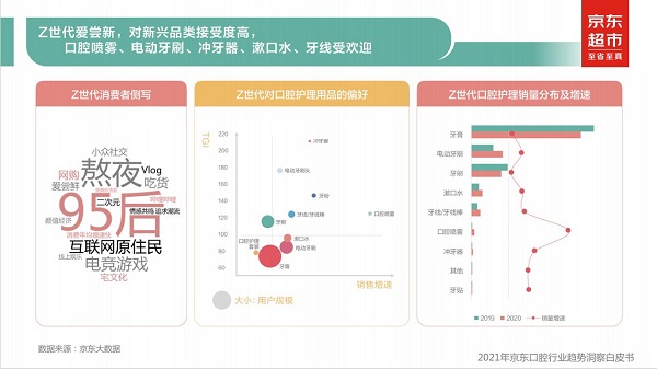 口腔领域也不例外,消费者对“新”的定义提出了颜值和健康层面的需求。6月15日,京东超市分享了《2021年京东口腔行业趋势洞察白皮书》(以下简称“报告”),报告显示,京东口腔护理品类用户规模连续三年高增长,随着消费者对健康、颜值关注度的提升,全民口腔护理意识显著增强,口腔护理需求更加细分,养护需求进一步升级,2020年口喷用户规模激增,冲牙器、漱口水、牙线等升阶新品类用品高速增长,Z世代、低线城市用户具备高增长潜力。