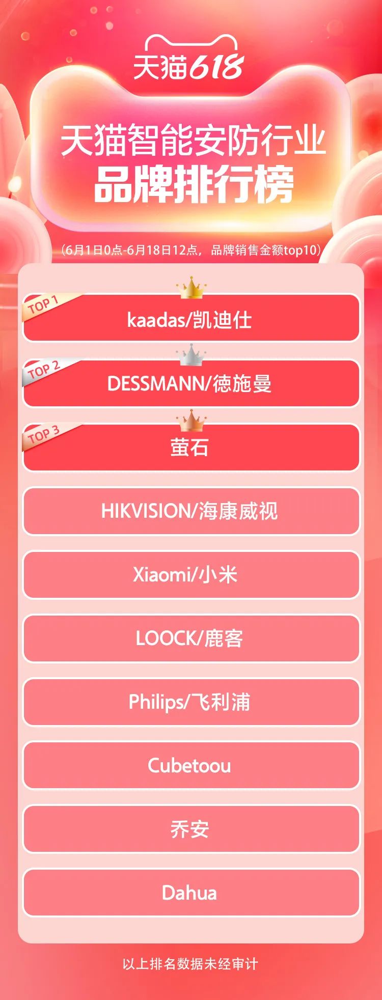 据天猫618官方数据显示,2021年618期间(6月1日 00:00-6月18日12:00),凯迪仕智能锁位列天猫智能安防行业品牌排行榜第一。
