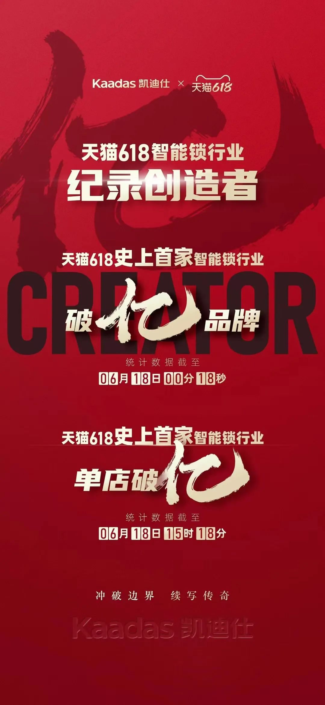在本次618期间,凯迪仕成为了天猫618历史上第一家智能锁行业破亿品牌、天猫618史上首家单店破亿品牌,智能锁行业天猫618双纪录创造者,更是连霸10个榜单第一。