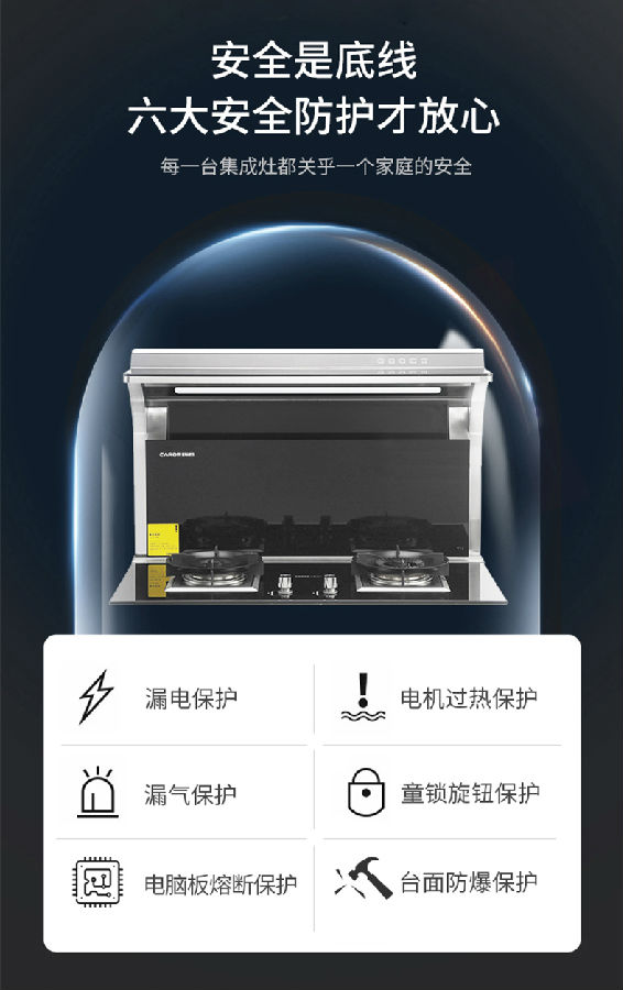 卡梦帝分体式集成灶的安全智能防护系统,当烟腔吸入明火或温度过高,立马切断气源及风机电路,汤水溢出浇灭炉火时,自动检测并关闭电源、气源,做饭时偶尔离开也不用担心会有危险和意外事故发生,而童锁式旋钮则为家里的孩子给予最周全的保护。
