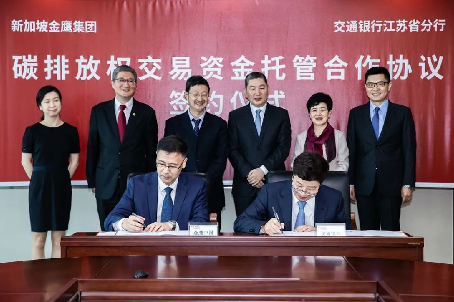 7月19日,全国碳交易市场正式上线三天之后,新加坡金鹰集团与交通银行江苏省分行在南京签署《碳排放权交易资金托管合作协议》。